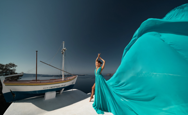 If you plan a private flying dress photoshoot in Santorini, look at Fira or Imerovigli then. Also, a beautiful love story photo session can be done in Oia (closer to Finikia) and the village of Profitis Ilias in Pyrgos. More Santorini photo ideas you may find in the article about the Flying Dress Photoshoot Locations. Spots to Take Best Santorini Sunset Pictures.
